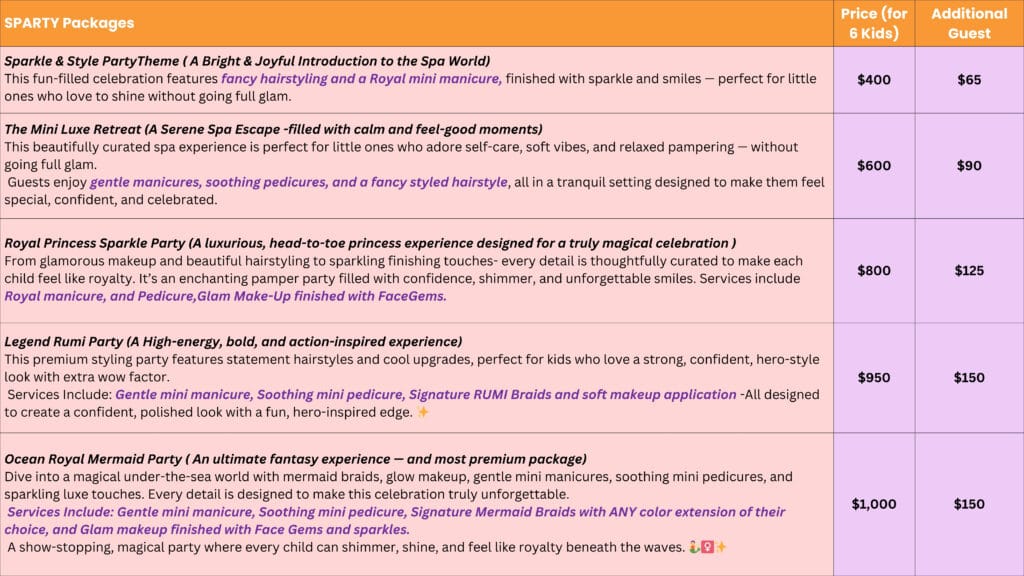 From glamorous makeup and beautiful hairstyling to sparkling finishing touches- every detail is thoughtfully curated to make each child feel like royalty. It’s an enchanting pamper party filled with confidence, shimmer, and unforgettable smiles. Services include Royal manicure, and Pedicure,Glam Make-Up finished with FaceGems.