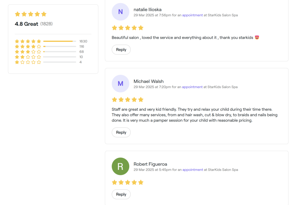 [fbrev page_name="StarKids Salon & Spa" page_id="112879530446974" page_access_token="EAAVVPjFKgSEBAIxKNDZBz3cuVwTb8b0y9V4dwVGsTXAuRx3n1tnOwOqk5Crfr3P0a8tiHqfpAW17qt0jEjKZCPRWBiTmPluU0byP64M7O366buKFT2XZAiW8afXb3vbDYZClVypJUa4iB6w4NBxZCBs4YfEeZA3Q7uKulDKJyzqZB1igiEkJhGIyDyJPgUHt3F73GOcG4m9DgZDZD" pagination="7" text_size="120" centered=true lazy_load_img=true show_success_api=true open_link=true nofollow_link=true api_ratings_limit="500"]